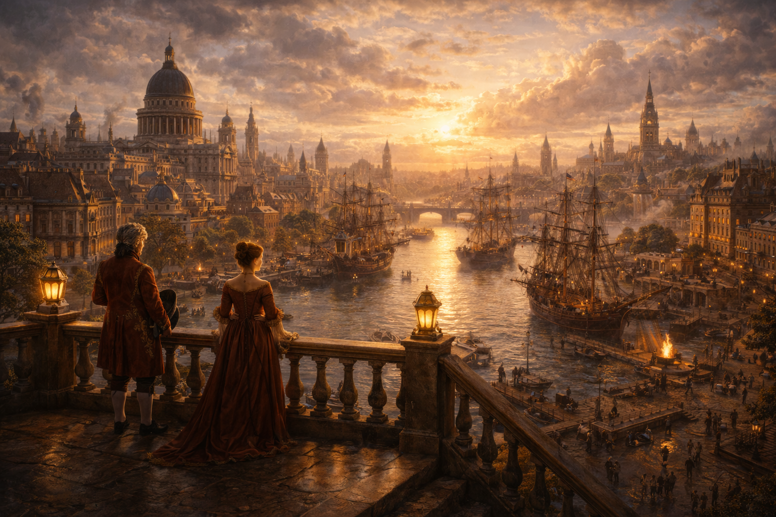 A golden sunset at a bustling harbor
